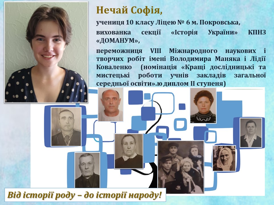 Цей успіх є результатом наполегливої роботи Софії та її керівника Колесникової Юлії Сергіївни, учительки історії Ліцею № 6 м. Покровська, з дослідження повсякденного життя українського села на початку 1930-х рр. У 2022-2023 н. р. Нечай Софія успішно виступила на ІІ (обласному) етапі Всеукраїнського конкурсу-захисту науково-дослідницьких робіт учнів – членів Малої академії наук України (секція «Історія України», диплом ІІІ ступеня); стала переможницею Всеукраїнського інтерактивного конкурсу «МАН-Юніор Дослідник» (номінація «Історик», диплом ІІІ ступеня). У 2023-2024 р. Софія опанувала методикою усноісторичних досліджень: зробила аудіозаписи інтерв’ю членів родини Тищенків, які переповіли спогади безпосередніх очевидців Голодомору-геноциду, транскрибування цих записів, оформила паспортні листи та протоколи інтерв’ю. У результаті була підготовлена науково-дослідна робота «Ризики та стратегії виживання українських селян в умовах Голодомору (за свідченнями родини Тищенків–Ішутових–Москалець)», яка отримала високу оцінку журі Міжнародного Міждисциплінарного конкурсу наукових і творчих робіт імені Володимира Маняка і Лідії Коваленко.