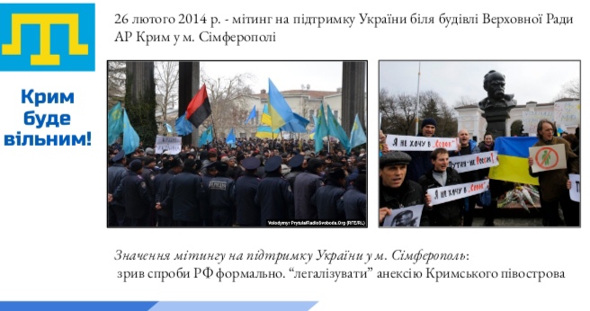26 лютого 2025 року в Україні відзначають 11 років початку спротиву окупації АР Крим і міста Севастополя. Цей день має нагадувати про мужність десяти тисяч жителів Кримського півострова, які 26 лютого 2014 року в Сімферополі вийшли на мітинг на підтримку територіальної цілісності України. Мітинг проводився за ініціативою Меджлісу кримськотатарського народу, який справедливо вважав: дії проросійських активістів і деяких депутатів Верховної Ради АР Крим, їхня співпраця з незаконними парамілітарними формуваннями свідчать про підготовку до російського захоплення півострова. 26 лютого 2014 року в мирний спосіб кримчанам вдалося не допустити позачергового засідання Верховної Ради АР Крим та перегляду статусу автономії у складі України.