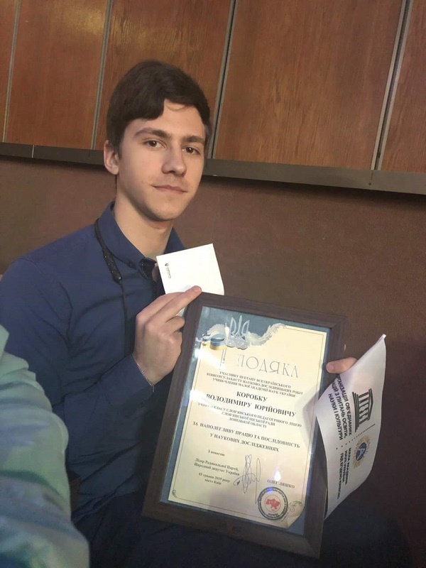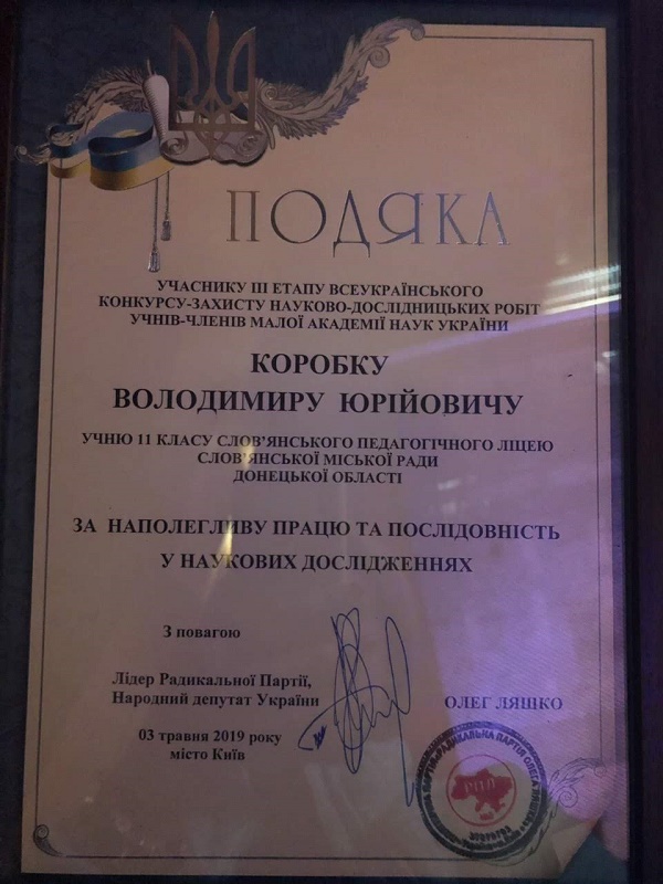 Народний депутат України, лідер Радикальної партії Олег Валерійович Ляшко висловив подяку за наполегливу працю та послідовність у наукових дослідженнях, нагородив цінним подарунком учасника команди від Донецької області Володимира Коробка, учня 11 класу Слов’янського педагогічного ліцею Слов’янської міської ради.
