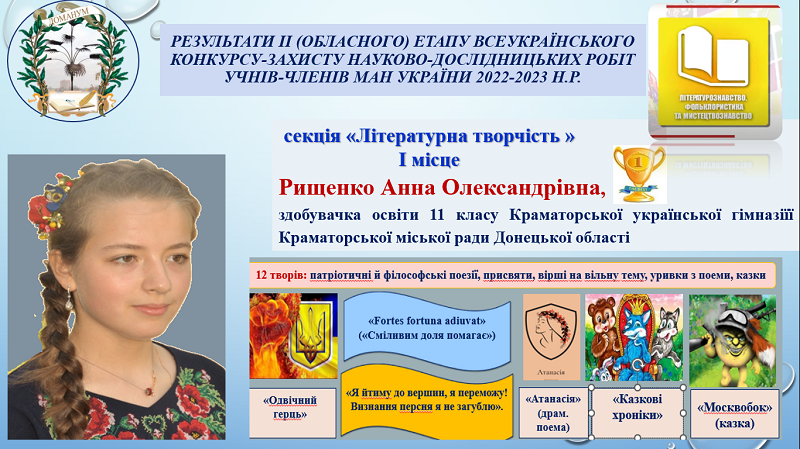 І місце в секції «Літературна творчість» за сумою набраних балів за програмою конкурсу-захисту виборола Рищенко Анна Олександрівна, здобувачка освіти 11 класу Краматорської української гімназіїї Краматорської міської ради Донецької області, тема дослідницького проєкту «Вогненний злам», науковий керівник – Мельник Ірина Романівна, учитель української мови та літератури Краматорської української гімназії.