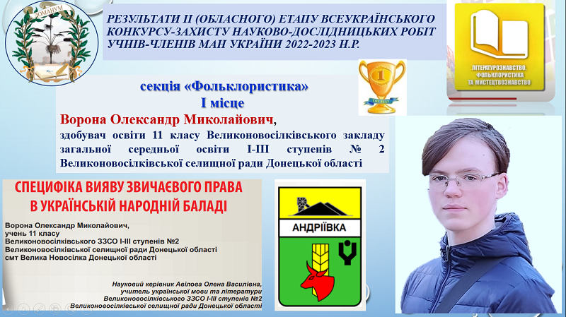 Олександр Миколайович, здобувач освіти 11 класу Великоновосілківського закладу загальної середньої освіти І-ІІІ ступенів №2 Великоновосілківської селищної ради Донецької області, тема дослідження «Специфіка вияву звичаєвого права в українській народній баладі». У своєму дослідженні автор звертається до цікавої та суспільно важливої теми, оскільки втілені у фольклорі, зокрема в баладах, правові норми протягом століть були важливим регулятором суспільних відносин в Україні. У своєї роботі конкурсант дослідив специфіку звичаєвого права в 17 українських народних баладах, записаних у селі Андріївка Волноваського району Донецької області.