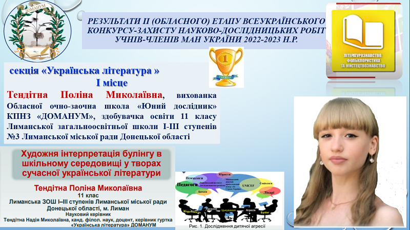 І місце в секції «Українська література» посіла Тендітна Поліна Миколаївна, вихованка Обласної очно-заочної школи «Юний дослідник» КПНЗ «ДОМАНУМ», здобувачка освіти 11 класу Лиманська загальноосвітня школа І-ІІІ ступенів №3 Лиманської міської ради Донецької області, тема дослідницького проєкту «Художня інтерпретація булінгу в шкільному середовищі у творах сучасної української літератури».