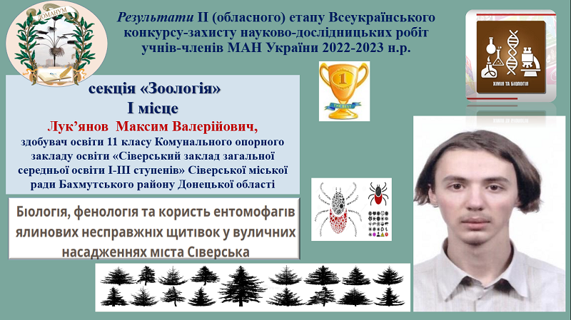 І місце в секції «Зоологія» посів Лук’янов Максим Валерійович, здобувач освіти 11 класу Комунального опорного закладу освіти «Сіверський заклад загальної середньої освіти І-ІІІ ступенів» Сіверської міської ради Бахмутського району Донецької області, тема дослідницького проєкту «Біологія, фенологія та користь ентомофагів ялинових несправжніх щитівок у вуличних насадженнях міста Сіверська». Наукові керівники – Меленті Вікторія Олександрівна, доктор філософії кафедри зоології, ентомології, фітопатології, інтегрованого захисту і карантину рослин Державного біотехнологічного університету, Миронова Надія Геннадіївна, учитель-методист хімії та біології. Актуальність представленої дослідницької роботи зумовлена необхідністю вивчення життєдіяльності ентомофагів в урбанізованих місцях та розробки методів для поліпшення екологічної ситуації в місті Сіверську. Дані про ентомофагів ялинових несправжніх щитівок можуть бути практично використані при плануванні захисних біологічних заходів боротьби зі шкідниками в містах із хвойними насадженнями. Практичне значення роботи полягає в розробці та використанні біологічних методів боротьби зі шкідниками.