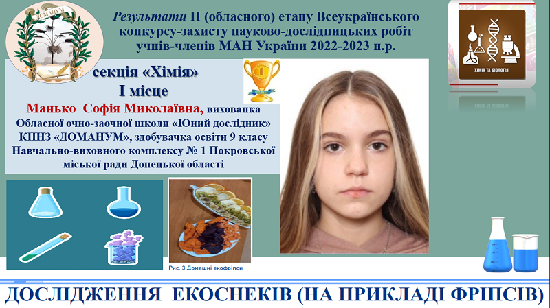 У секції «Хімія » цього ж відділення переможницею стала Манько Софія Миколаївна, вихованка секції «Хімія» Обласної очно-заочної школи «Юний дослідник» КПНЗ «ДОМАНУМ», здобувачка освіти 9 класу Навчально-виховного комплексу №1 Покровської міської ради Донецької області, тема дослідження «Дослідження екоснеків (на прикладі фріпсів)», науковий керівник – Мігутіна Олена Олександрівна, учитель хімії НВК №1.