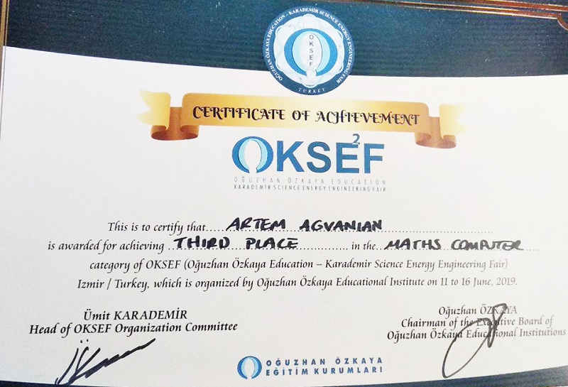 Агванян Артем Робертович, учень 10 класу комунального закладу «Маріупольський технічний ліцей» Маріупольської міської ради брав участь у складі делегації учнів Малої академії наук України у виставки-конкурсу OKSEF.