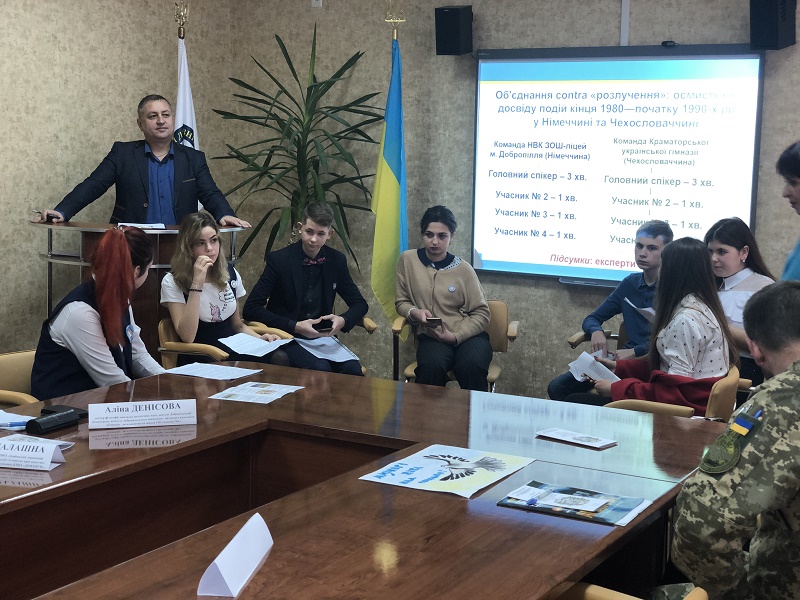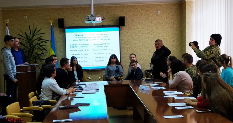 Так, команди ЗОШ №13 м. Слов’янська та ЗОШ №9 м. Мирнограда спілкувались у інтелектуальному рингу «Примирення contra покарання: осмислення досвіду революції кінця 1980-х рр. у Польщі та Румунії». Виступи учасників (науковість, логічність, ораторське мистецтво) оцінювали експерти: Аліна Денисова, доктор філософії, кандидат політичних наук, депутат Добропільської міської ради, учитель Добропільського навчально - виховного комплексу «Гімназія - загальноосвітня школа І-ІІІ ступенів №1» Добропільської міської ради Донецької області та учні ЗОШ І-ІІІ ст. №13 м. Слов’янськ та ЗОШ І-ІІІ ст. №9 м. Мирноград.