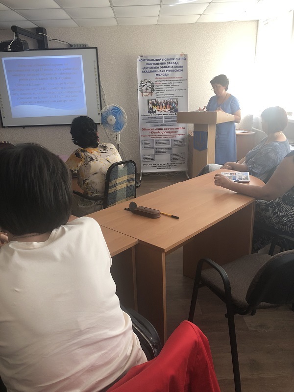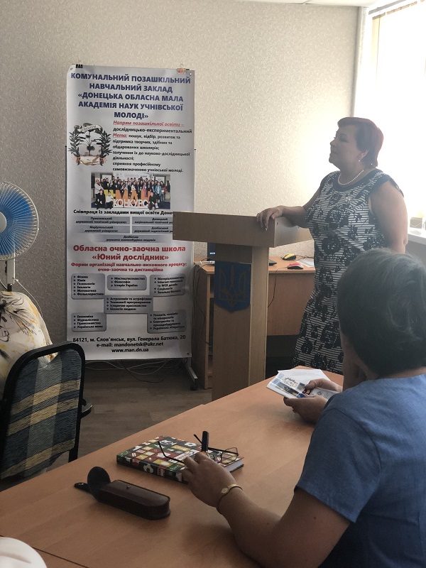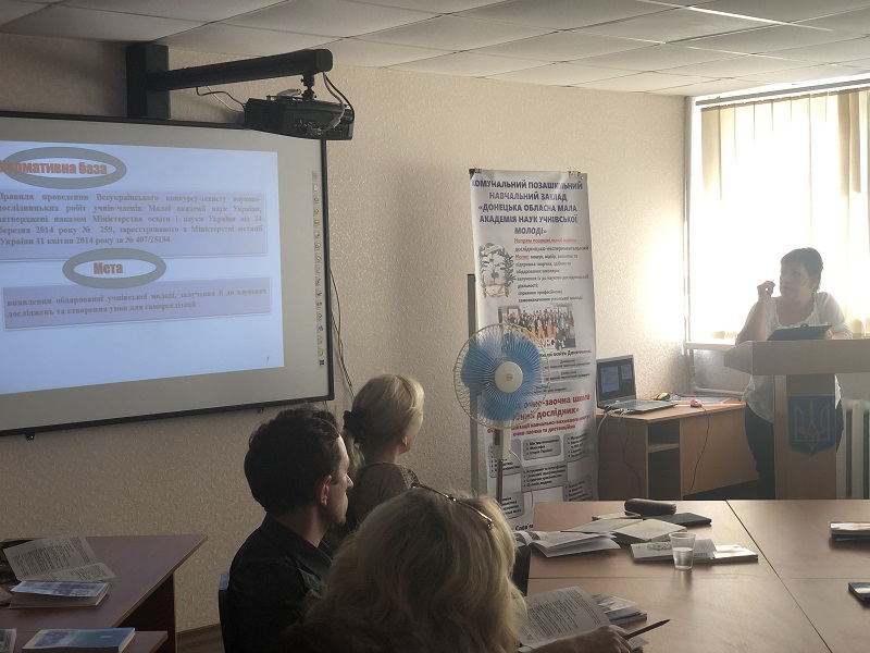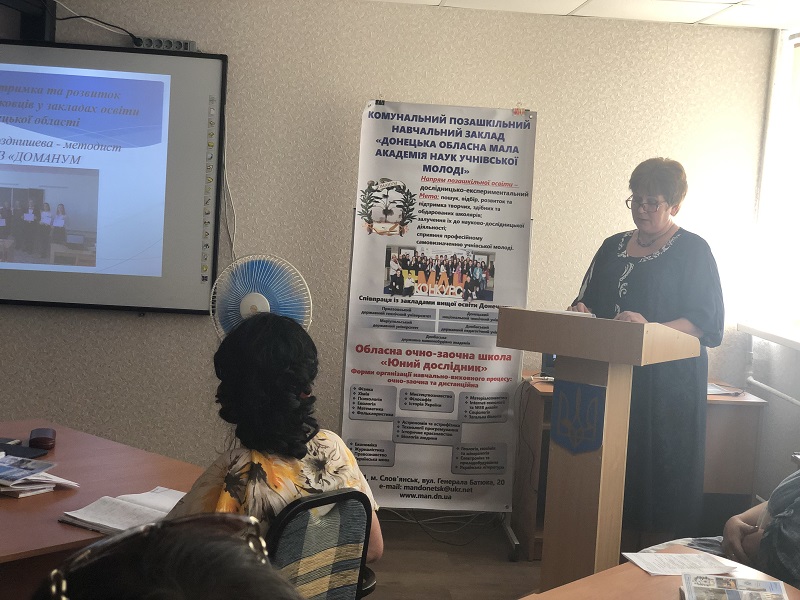 Методист Людмила Позднишева познайомила присутніх з роботою обласної очно-заочної школи «Юний дослідник» яка працює при КПНЗ «ДОМАНУМ». А керівник секції ОЗШ «Юний дослідник», кандидат психологічних наук, доцент, викладач кафедри загальної психології ДВНЗ «Донбаський державний педагогічний університет» Ірина Остополець поділилася досвідом роботи «Психологія».